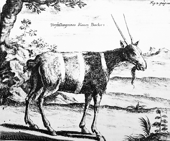 ブルーバックは、自身の存在をヨーロッパの博物学者らやハンターらに知られたときには、すでに絶滅への道を歩んでいた。ドイツ人ペーター・コルプは、1719 年にブルーバックの存在について最初に記した人物だ。彼はブルーバックを大型のヤギと記述し、後に彼の記憶に基づいて描かれた博物画には、長いひげや尻尾など典型的なヤギの特徴が描かれていた。ちなみにその尻尾について、房状であることは正しかったのだが位置は実際よりもかなり上の方に描かれていた。後にコルプの描画は、ダニエル(1804-08)によってブルーバックのイラストの参考資料とされ、さらにジャーディーン(1839)により複製もされたが、それには雌には角がないというような別の誤りまで混在するようになった。コルプの記述から約50 年後の1767 年に、P.S. パラスによってブルーバックはやっとレイヨウとして分類上正しく記述されることとなる。