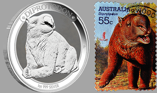 Rhino wombat on the stamp and Silver coin (Click to view larger image).