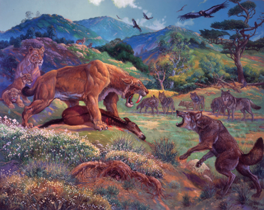 約12700年前に大型の哺乳類たち90種以上が絶滅した。南北アメリカの大型の草食動物の絶滅によってダイアウルフも獲物の大部分を失った。大型の肉食動物や腐肉を食べる動物たちが絶滅したのは、この大型草食動物の絶滅が原因と考えられる。約16000-10000年前にダイアウルフが絶滅したのは、気候変動や人間などほかの種との競争といった別の要因も影響したと考えられる一方で、ヨーロッパオオカミは絶滅を免れている。