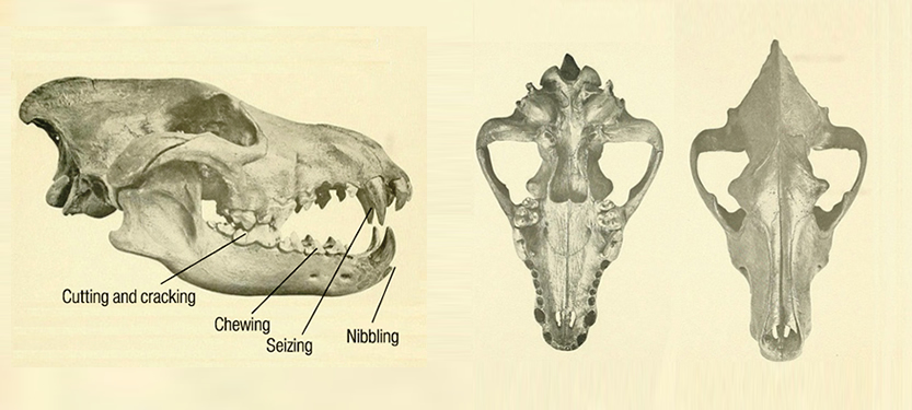 ダイアウルフの頭骨標本と歯の機能解説 (画像をクリックで拡大表示)