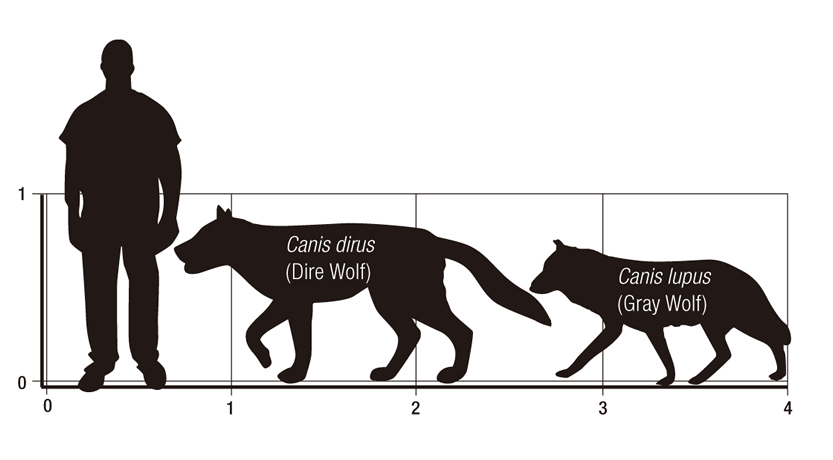 ダイアウルフと、現生のオオカミ、そして人間との大きさ比較 (画像をクリックで拡大表示)