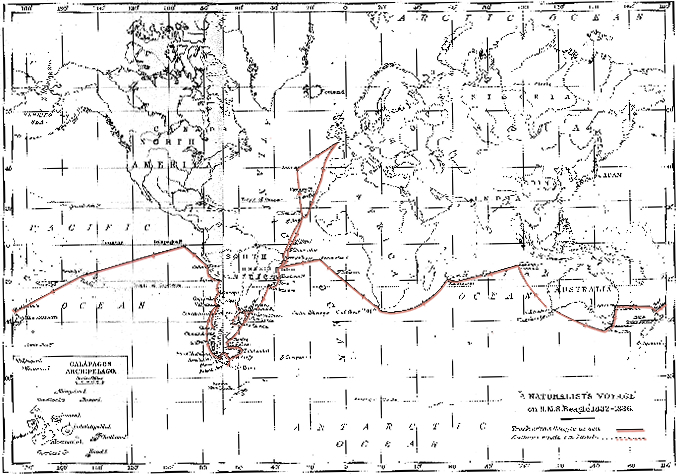 ビーグル号の旅した足跡(地図上の赤いライン)