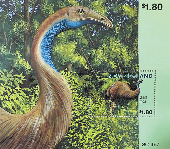 Only very few birds are more famous than the flightless moa. The altogether 9 species (in 3 families and 6 genera) of this endemic New Zealand bird look similar to an ostrich, but moa are the only real wingless birds, lacking even the vestigial wings which all other ostriches, nandus, emus, cassowaries and kiwis have. Most of the moa species had the size of a large turkey. They measured with an outstretched neck 67-150 cm and weighted 30-75 kg. But two species were much larger and real gigantic, namely the Giant moa Dinornis robustus on South Island and Dinornis novaezelandiae on North Island. They reached about 3.6 m in height with neck outstretched and weighed about 230 kg. To create an impressive height and appearance, in museums moa skeletons are traditionally mounted in an upright position, but a detailed analysis of the skeleton and the head indicates that in fact the moa normally carried their head forward like the kiwis and used the long neck only to pick leaves in the higher bushes.