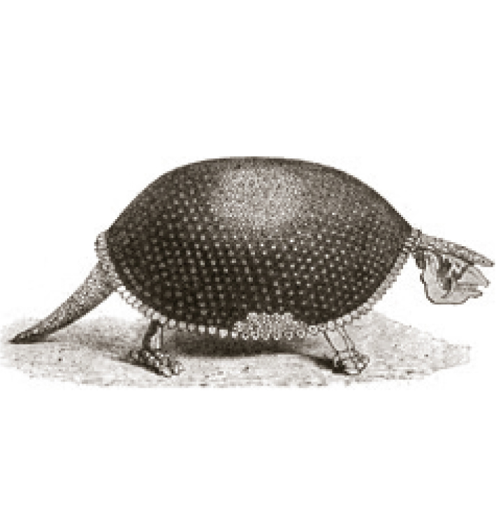 我がLOST ZOOが数ヶ月の時を経て新たに飼育展示を始めたのは、南米か らやってきたグリプトドンのペアである。まずもってほとんどの来園者諸氏が、巨大なカメの仲間であると思うに違いない。しかし実際には紛れもなく哺乳類であり、現生のアルマジロと非常に近い近縁種にあたる。全体にまん丸い形の骨ばった甲としゃがんだかのように見える手足が、グリプトドンをカメのように思わせる。この背中部分は、約1000枚からなる厚さ約2.5 cmの骨質のプレート状の鱗甲板で覆われている。