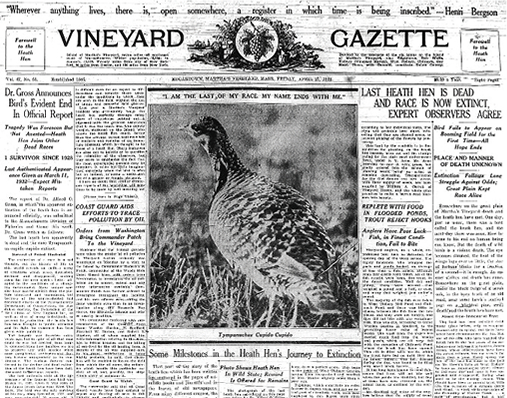 しかし、そのような激しい乱獲のせいで、ヒー スヘンの個体数は急激に減少した。早くて1840年代、遅くても1870年代に は本土のすべてのヒースヘンが絶滅し、マサチューセッツ州沖の島、マーサズ・ ビンヤードに300羽が残るだけとなった。しかし野生のネコ類による捕食や、 密猟によってその数はさらに減少し1890年までに120~200羽、1800年代 終わりには約70羽が残るだけとなった。その後、密猟禁止法で保護されるよう になり、1908年には「ヒースヘン保護区」が制定されたこともあって、個体数 は急激に増加し再び2000羽近くになった。1910年代半ばにはヒースヘンの求 愛行動の見学が観光名所ともなった。