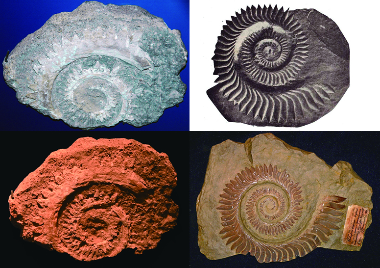 1世紀以上もの間、専門家らはこの螺旋状の歯がどのように顎に 収まっていたのか理解しようと努めてきた。その歯は口先や下顎、背ビレや尾 ビレから垂れ下がっていたのか、またはのどの奥に埋め込まれていたのか、などなど想像力を膨らませながらその視覚化を試みた。やがて専門家らは「歯は 長い下顎の先にあった」という見解に同意したが、その後も芸術家や科学者らは、 また別の説を唱えている。この恐ろしいtooth whorlは下顎から外側に巻いていたと推測する者もいれば、下顎の内側に巻いていたと推測する者、はたまた下顎の奥の方にあったと推測する者など、さまざまな説があった。更には、上顎と下顎の両方に渦巻き状の歯があったのではという説まで存在しているから興味深い。