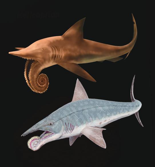 ヘリコプリオンに関して化石を通じて残された手がかりは、tooth whorlと頭蓋骨と下顎の押しつぶされた軟骨の痕だけである。ここにあるイメージは他の古代ザメやギンザメを基に推測された、復元図である。(画像をクリックで拡大表示)