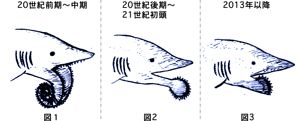 研究初期段階では、tooth whorl は口だけでなく背びれや尾びれなど体のさまざまな部位に位置し、防御の役割を果たしていたと考える研究者らもいた。最も一般的だったものは、長くて巻き付けるのに適した鞭のような図だ。(図1)エサとなる対象が、この鞭でダメージを受け泳げなくなったところを捕食すると考えられていた。しかしこの考え方の問題点は、“ 鞭”が伸びた状態では一度も見つかっていない点であった。その後、ヘリコプリオンは渦巻かれたtoothwhorlを長い顎の先に持つと考えられるようになった。(図2)しかし、更なる研究とCT スキャンによって、押しつぶされた軟骨の発見され、2013 年に初めて一部の顎の復元が行われた。これにより、渦巻き状のtooth whorlを短い顎に有するという、新たなヘリコプリオンの姿が明らかになった。(図3)(画像をクリックで拡大表示)