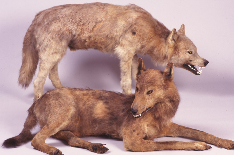 現在では、北海道大学植物園で唯一のエゾオオカミのペアの剥製を見ることができる。1881年に6月豊平区でメスが捕獲され、1879年8月白石区でオスが捕獲された。どちらも絶滅寸前に発見された、数少ない剥製である。一方、ホンシュウオオカミは19世紀に人間による大量捕獲が原因で絶滅した。1732年に狂犬病が日本に渡り、19世紀には二ホンオオカミの間で大流行した。おそらく、周辺の犬から感染したと考えられている。しかし、実はこれは二ホンオオカミを駆除していた人間にとっては逆に好都合だった。1905年には最後の野生のホンシュウオオカミは奈良の東吉野村で捕獲された。死体はアメリカ人を介してロンドン自然史博物館に売却された。最後のホンシュウオオカミは1881年に岩手県から東京の動物園が買い取ったが、1892年6月24日に飼育下にて死亡した。このオオカミの剥製は東京大学農学部に保管されている。現存する剥製はそれを含め、世界中に5体のみである。
