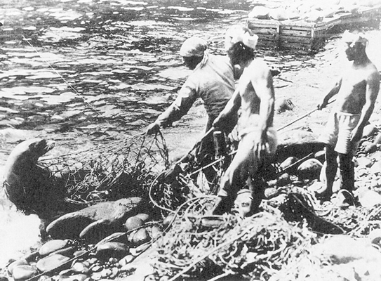 ニホンアシカは19 世紀中頃には、約30,000 - 50,000 頭が生息していたとされる。漁師の捕獲記録によると、1900 年代始めには年間3,200 頭ほどのニホンアシカが捕獲されていたが、1915 年にはそれが300 頭に減少。1930 年代には十数頭にまで減少し、1940 年代には絶滅が危惧されたため捕獲は無くなった。(日本人によって合計16,500 頭のニホンアシカが商業目的に捕獲されたという記録が残されている。)第二次世界大戦の海上戦でニホンアシカの生息環境が破壊されたことも無関係とは言えないが、絶滅に追い込まれた要因は、漁師たちの駆除もしくは乱獲というこの1点のみに尽きると言えるだろう。