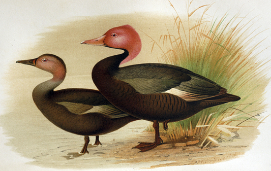 インドにおいても特にありふれた身近な種ということはなくそれなりに珍しい鳥だったはずだが、バライロガモはその有名な美しい色のため、絶滅してもなおインドの鳥類図鑑の表紙などになっている。