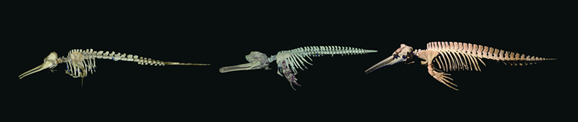 左から順にガンジスカワイルカ、ボリビアカワイルカ、アマゾンカワイルカの骨格標本(画像をクリックで拡大表示)